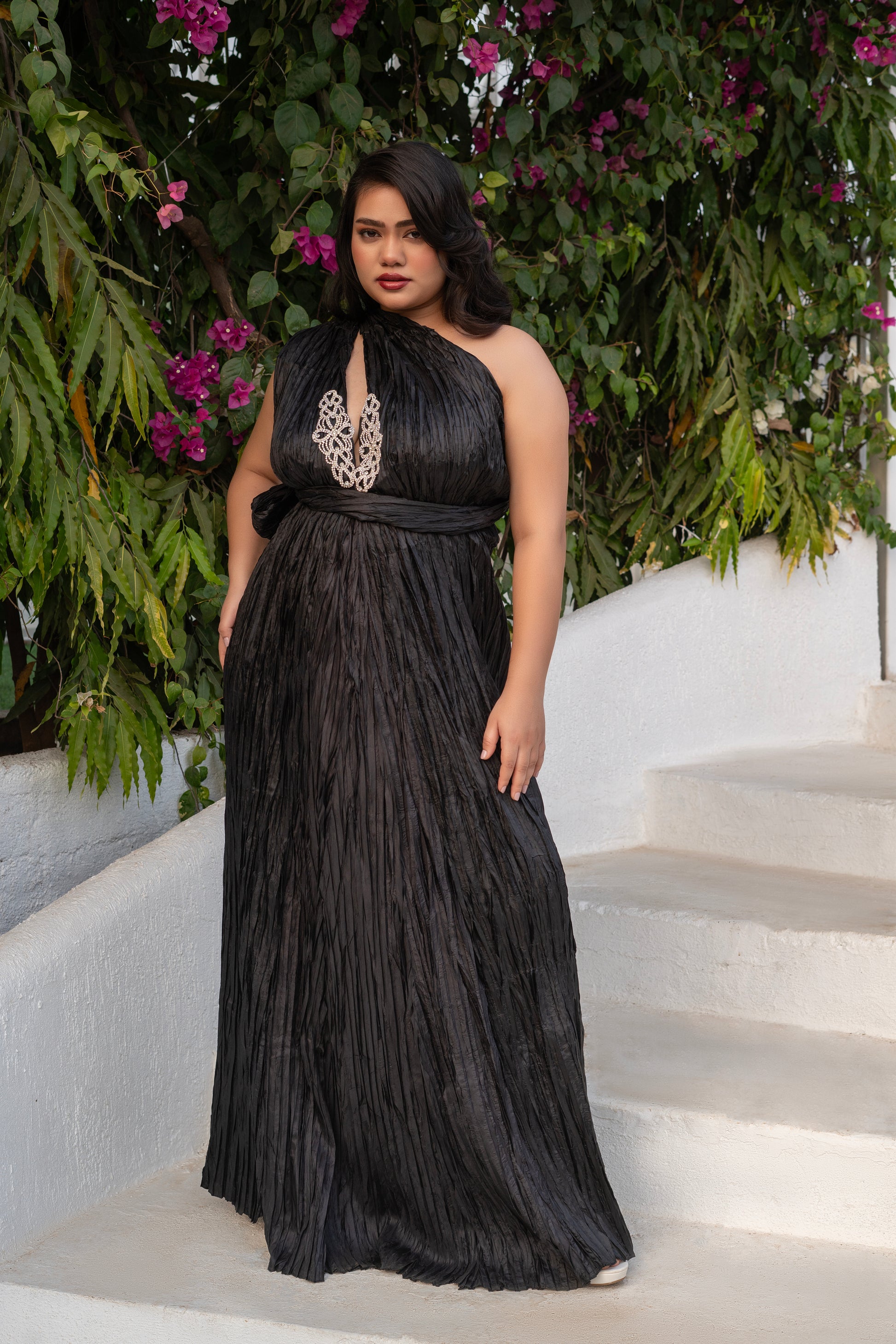 The Lush Dress offers a luxurious look and feel with its pleated texture and sparkling diamond brooches. With multiple styling options and a versatile belt, it is perfect for resort wear, evening events, or any occasion that calls for effortless sophistication. Elevate your wardrobe with this elegant dress.