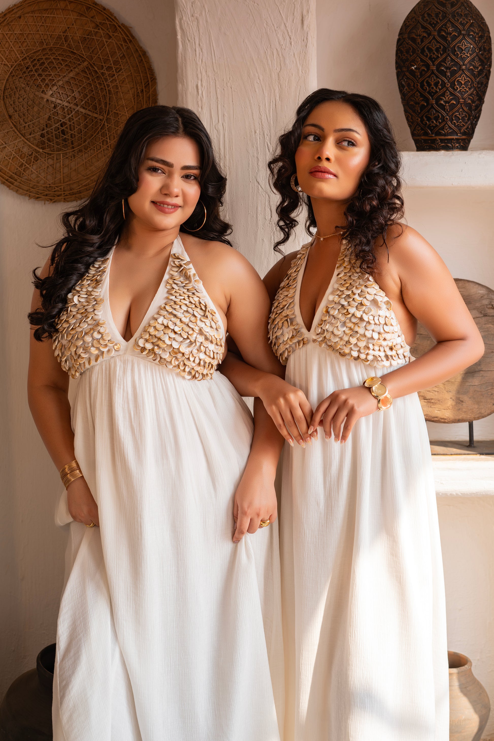 Unwind in style with the Sea Sway Dress. Its breezy design and shell-inspired sequins exude coastal charm, while the deep V-neckline and open-back silhouette add a touch of allure. Made from breathable fabric, it's the perfect choice for a day at the pool or a night out on the beach. An effortlessly chic addition to your vacation wardrobe.